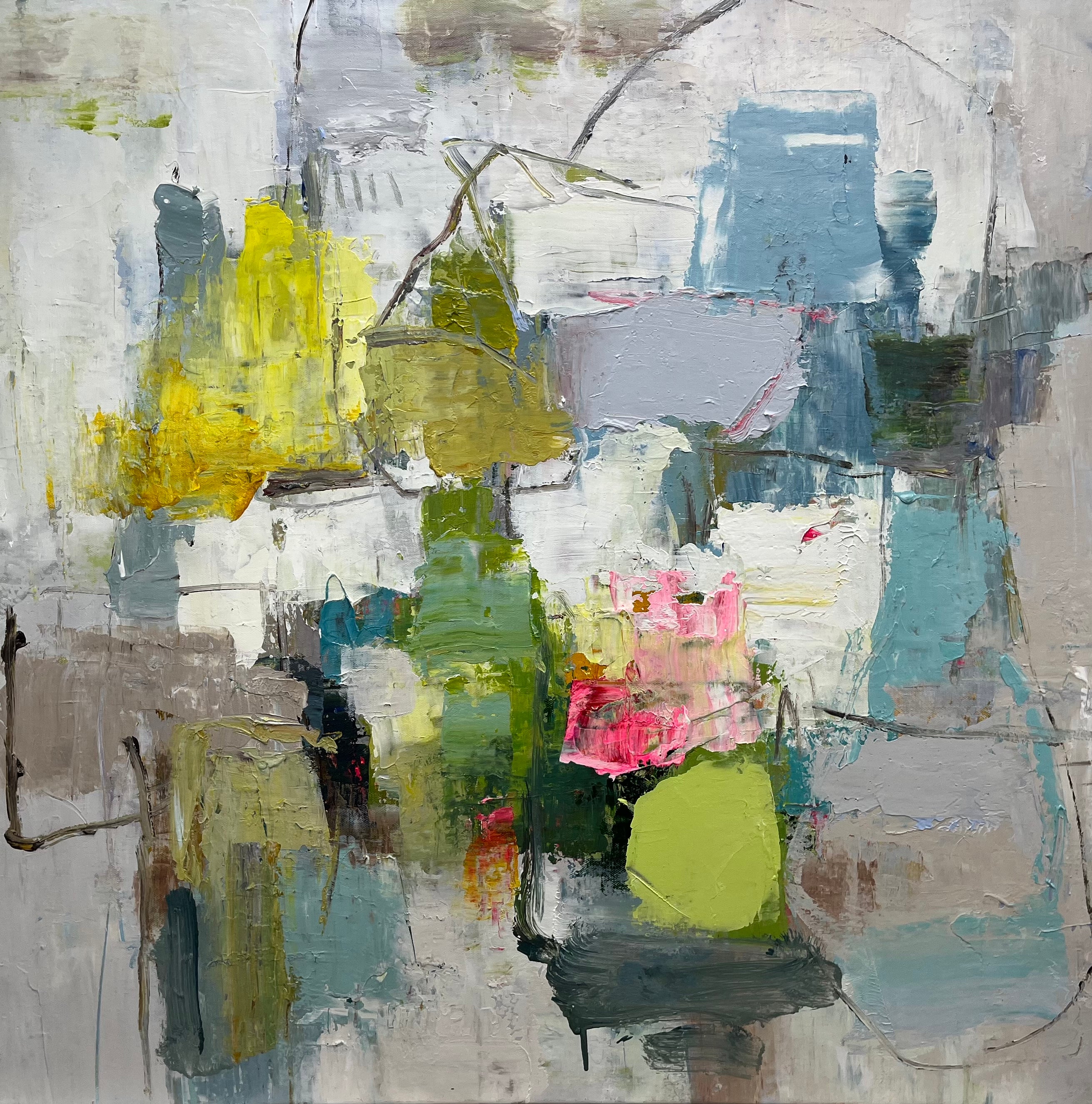 | Colors | Dominant muted tones (grays, whites, soft blues) with bold accents: bright yellow, vivid green (two shades: light and dark/olive), teal, and a vibrant pink floral cluster. Balanced cool and warm hues. |